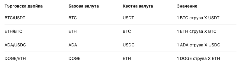 - BTC/USDT → Bitcoin (BTC) е базовата валута, Tether (USDT) е котираната валута.