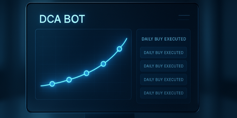 The bot automatically buys a chosen crypto asset daily, weekly, or monthly, regardless of price. Over time, this reduces the impact of short-term volatility.