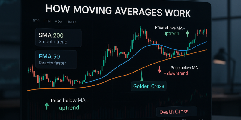 - Trend direction: Price above MA = uptrend; below MA = downtrend