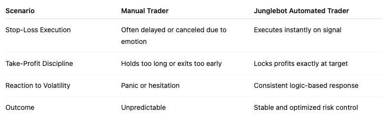 This comparison shows how automation enforces discipline — the key to sustainable growth in crypto trading.