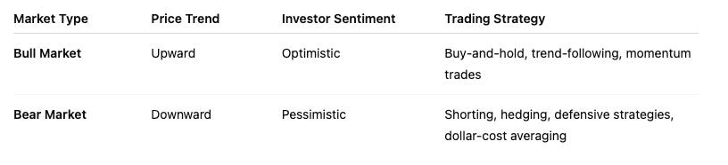 A bull market occurs when prices rise steadily and optimism dominates. A bear market happens when prices fall and pessimism prevails. Recognizing these trends helps crypto traders adjust strategies, manage risk, and capitalize on opportunities.